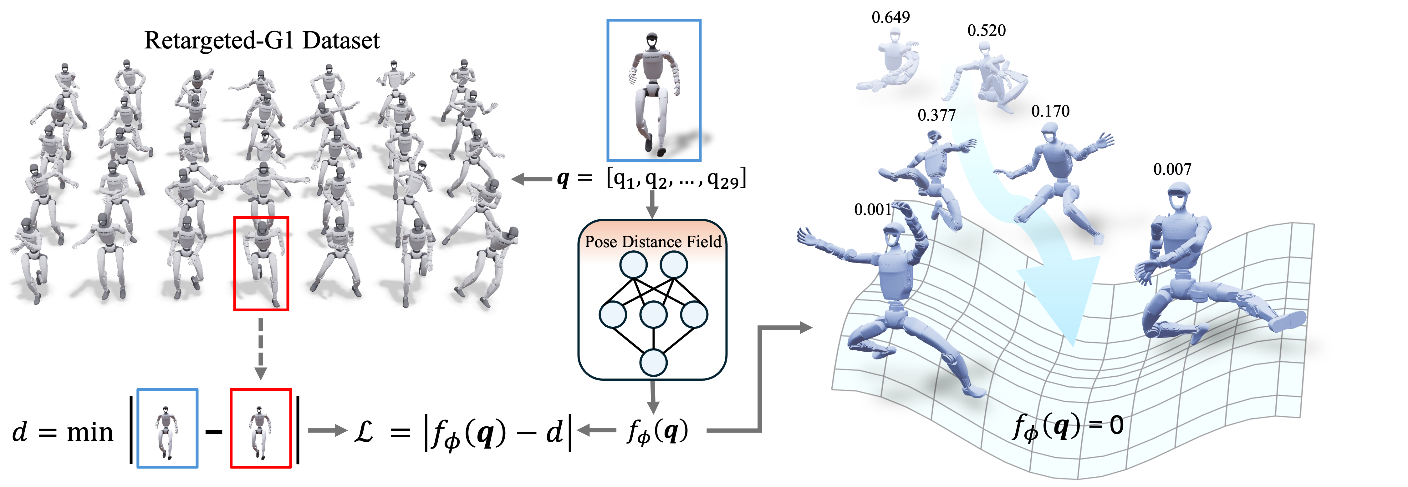 As shown in pipeline, we learn the manifold of plausible G1 poses as a zero-level set. Left: The network $f_\phi$ approximates the unsigned pose distance field. For a query pose $\mathbf{q}$, it regresses the distance $d$ to the nearest dataset sample. Right: The prior quantifies plausibility, where higher $f_\phi(\mathbf{q})$ values indicate significant deviation from the manifold (unnatural poses). This metric effectively guides optimization in downstream motion tasks.